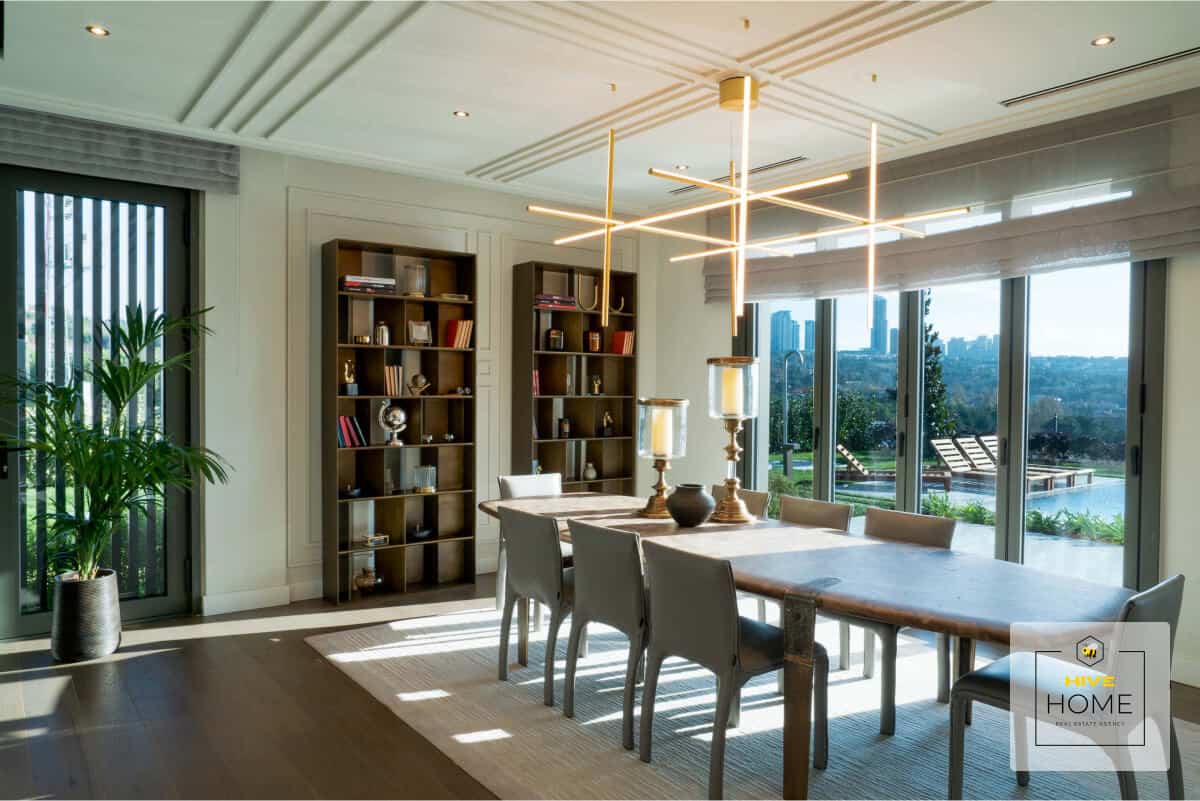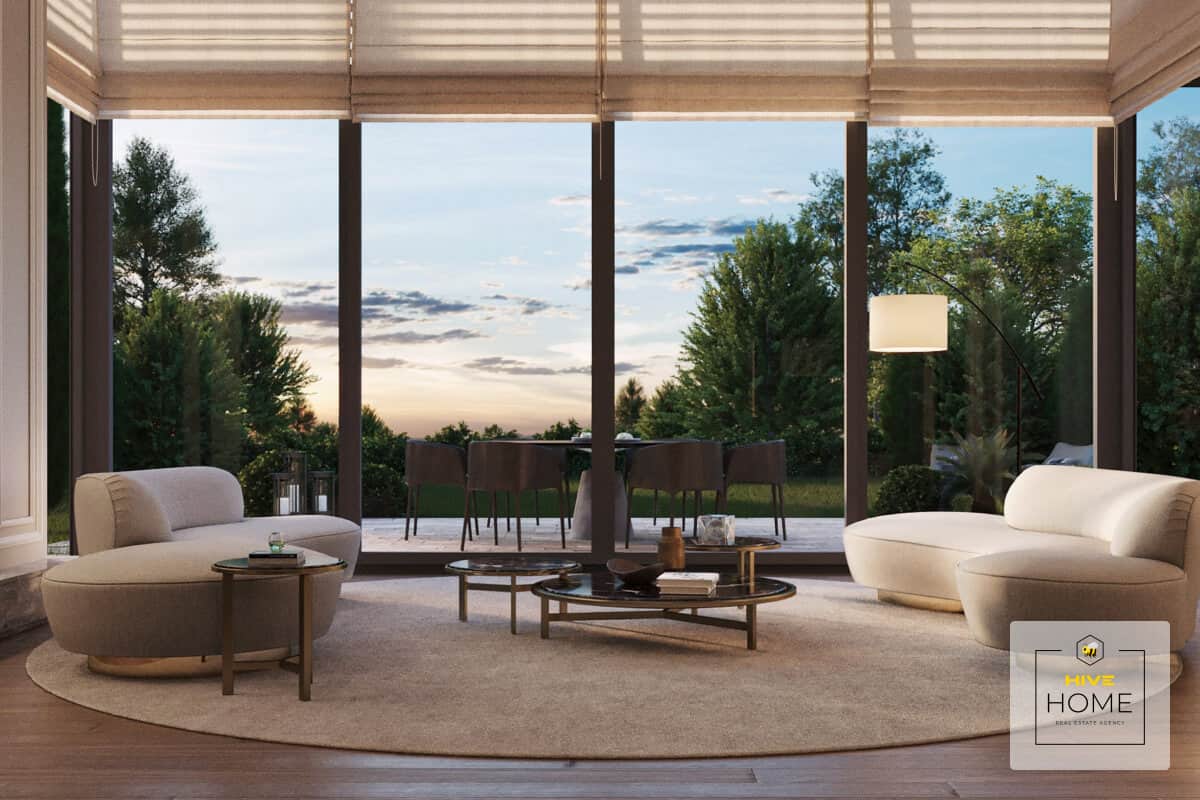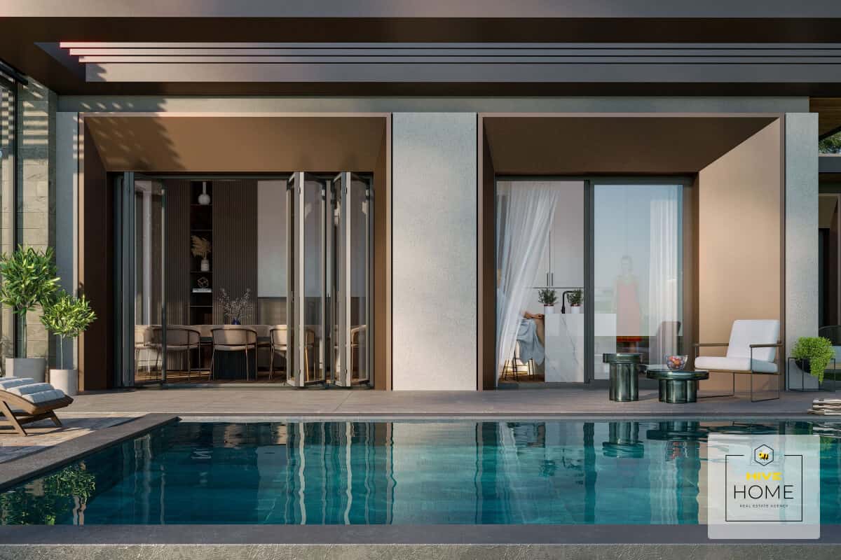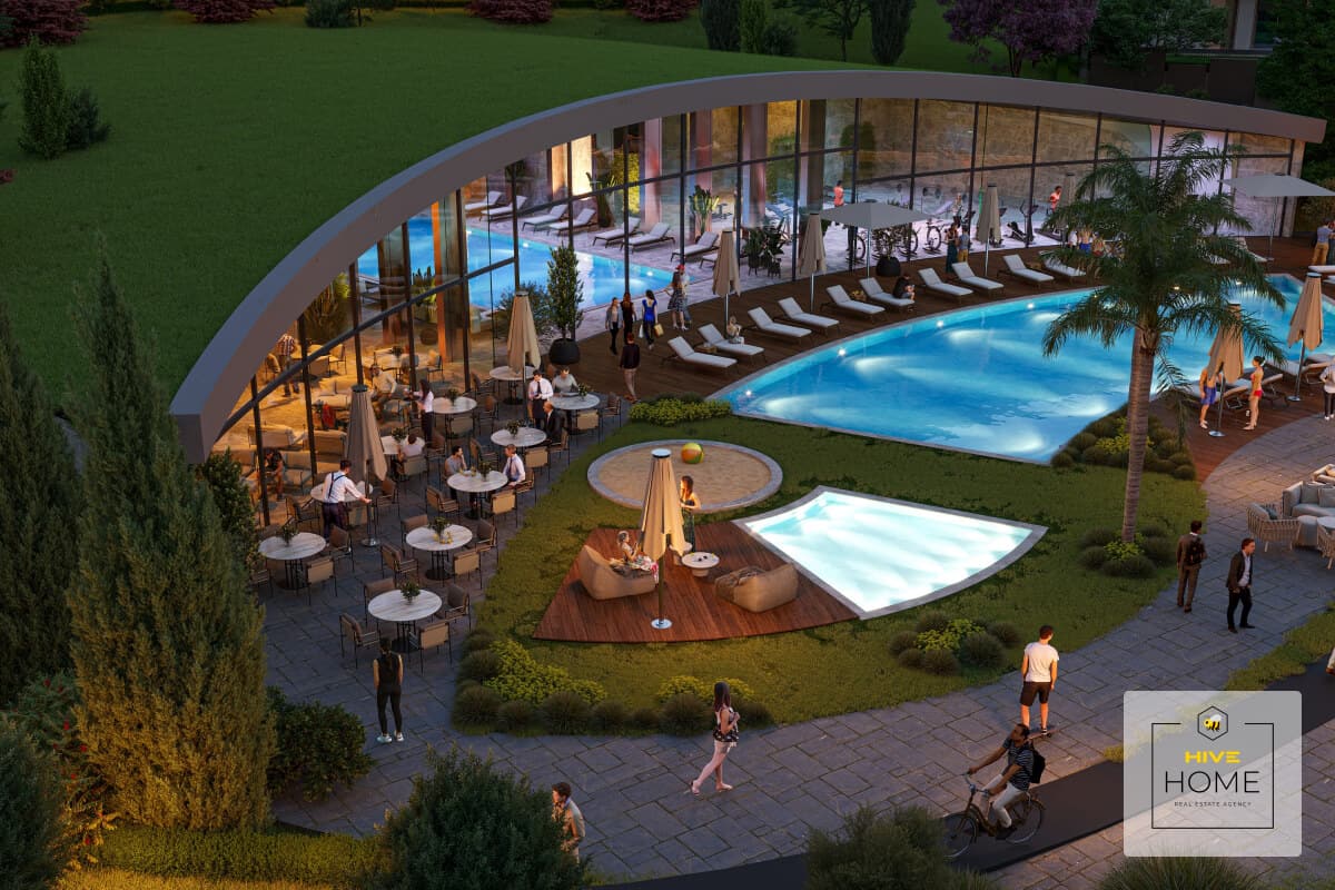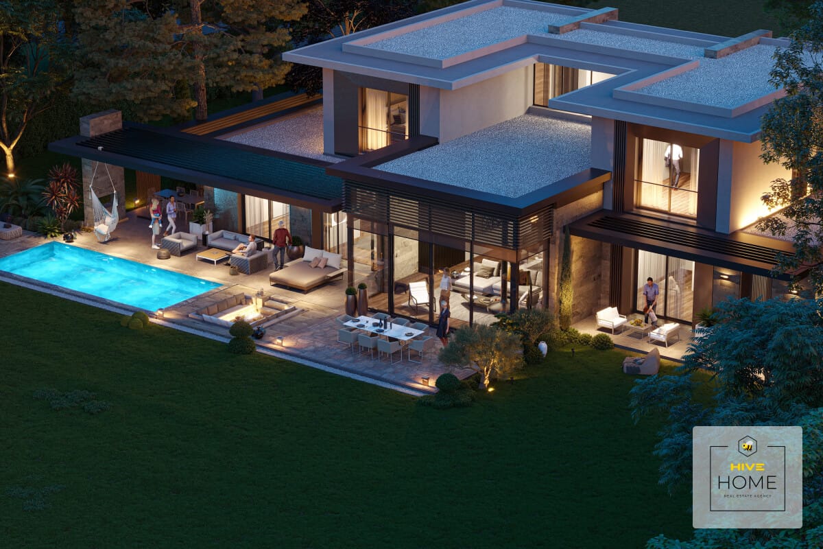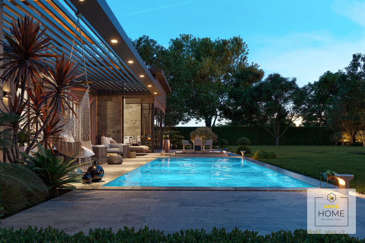 Озелененная территория площадью 95.500 кв. м с богатыми социальными зонами, большими собственными садами, выходом на террасу, уникальным ландшафтом и частными бассейнами.